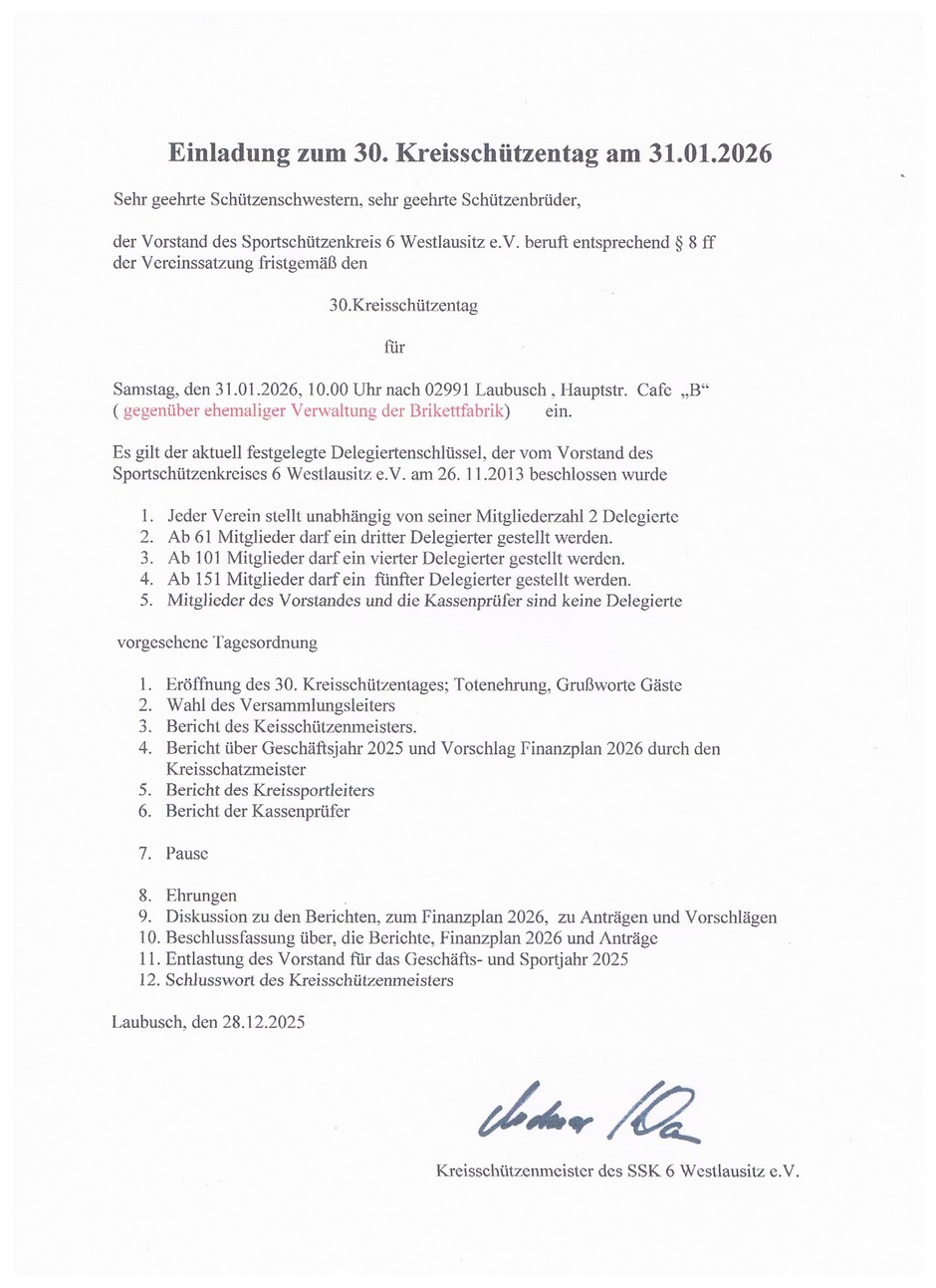 Der 29. Kreisschützentag mit Wahlen findet am 25.01.2025 in Königsbrück statt.